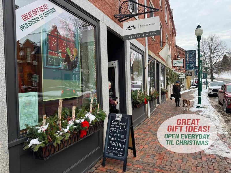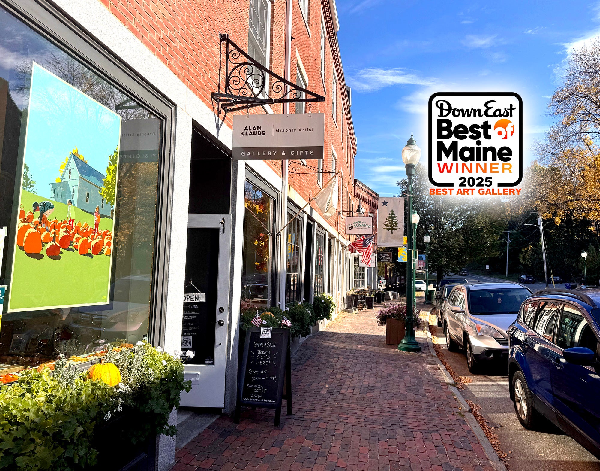 Down East Magazine's Best Art Gallery In Maine 2025 Winner! Overlooking the Kennebec River, the Alan Claude Gallery is located in historic downtown Gardiner. Alan Claude's Poster Style art of lighthouses, coastal and lake scenes of Maine and other New England states are boldly displayed in the artist's beautifully restored buildings and gallery. Alan Claude's Maine Calendar series are among one of the most popular gifts for visitors and locals alike. Other items include coasters, stickers and notecards. Come and check it out or order online - $75 Minimum Order for FREE SHIPPING - We ship within 1 to 3 days for most items, larger framed prints such as 24x36 and Grand Views will ship in 5-9 days.