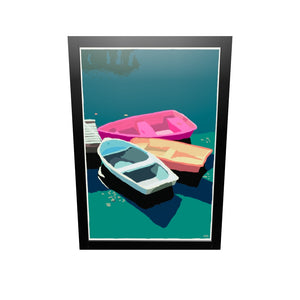 Three brightly colored tenders intimately docked on a calm dark green water background