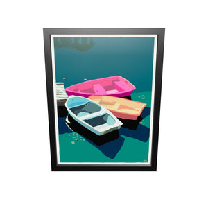 Three brightly colored tenders intimately docked on a calm dark green water background