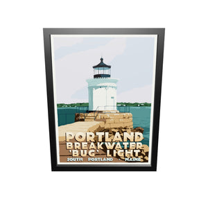 Portland Breakwater Bug Light Art Print 18" x 24" Framed Travel Poster By Alan Claude - Maine