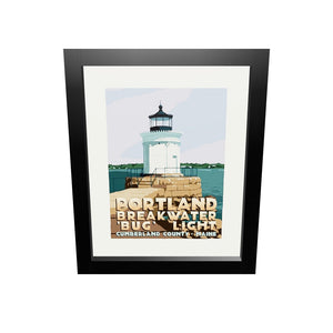 Portland Breakwater Bug Light Art Print 8" x 10" Framed Travel Poster By Alan Claude - Maine