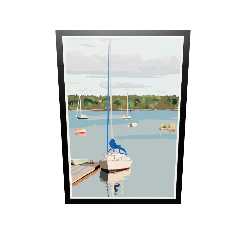 Sailboats in Round Pond Harbor Art Print 24" x 36" Framed Wall Poster By Alan Claude - Maine
