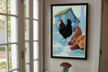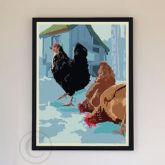 Winter Chickens Art Print 24" x 36" Framed Wall Poster By Alan Claude - Maine