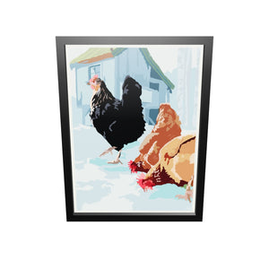Winter Chickens Art Print 18" x 24" Framed Wall Poster By Alan Claude - Maine