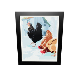 Winter Chickens Art Print 8" x 10" Framed Wall Poster By Alan Claude - Maine