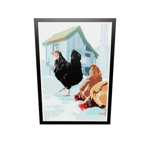 Winter Chickens Art Print 36" x 53" Framed Wall Poster By Alan Claude - Maine